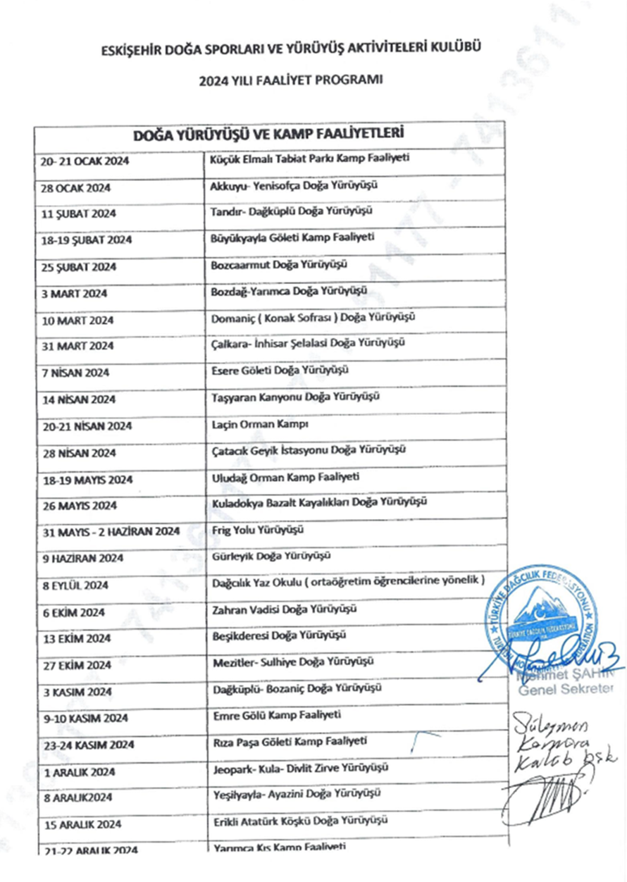 Kulübümüzün 2024 faaliyet programı Türkiye Dağcılık Federasyonunca onaylanmıştır.